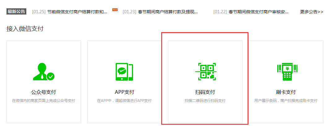 2. 微信公众号申请完毕,及要去商户平台申请“扫码支付”功能:https://pay.weixin.qq.com/index.php/core/home/login?return_url=%2F