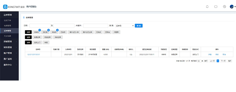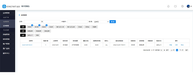 “运单管理”页面可以查看“待审核”“待付款”“待发货”“海外仓已入库”“海外仓已出库“ “ 已完成 ”已取消”问题单”等状态的运单,界面如下: