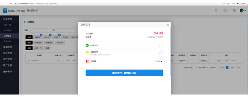 管理员审核运单后,运单状态变成“待付款”,会员可查看运单详情 或者 对订单进行“付款或取消”操作(说明:如个人资料中,开启了自动扣款功能,余额足够扣款的情况下有优惠券情况下会自动使用最大金额优惠券,运单审核通过后会直接扣款,运单处于待发货状态,后台安排发货使用即可)。