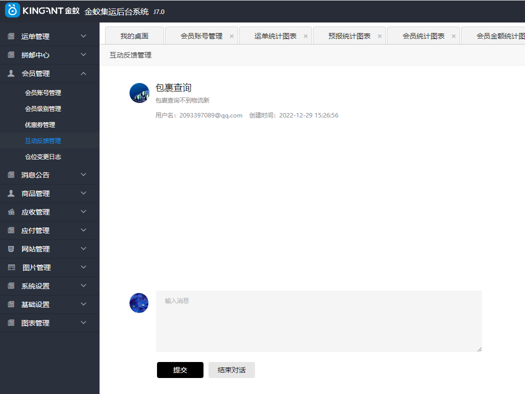 互动反馈管理”页面,可以查看到会员在会员中心提交的留言反馈。