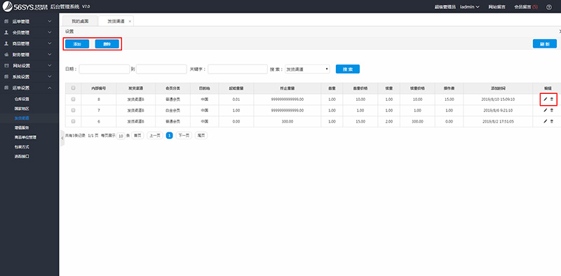 2)在“运费设置”或“运费成本设置”页面,点击“添加”“删除”及 铅笔图标,可分别进行 运费 或 运费成本 的增加、删除及编辑等操作。
