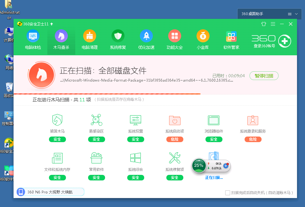 完成后先全盘扫描一遍,如发现病毒或者木马,直接删除。