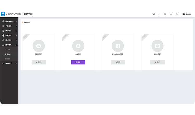 第二步:点击左侧导航,选择“账户管理”,点击“账号绑定”功能。操作界面,如下图: