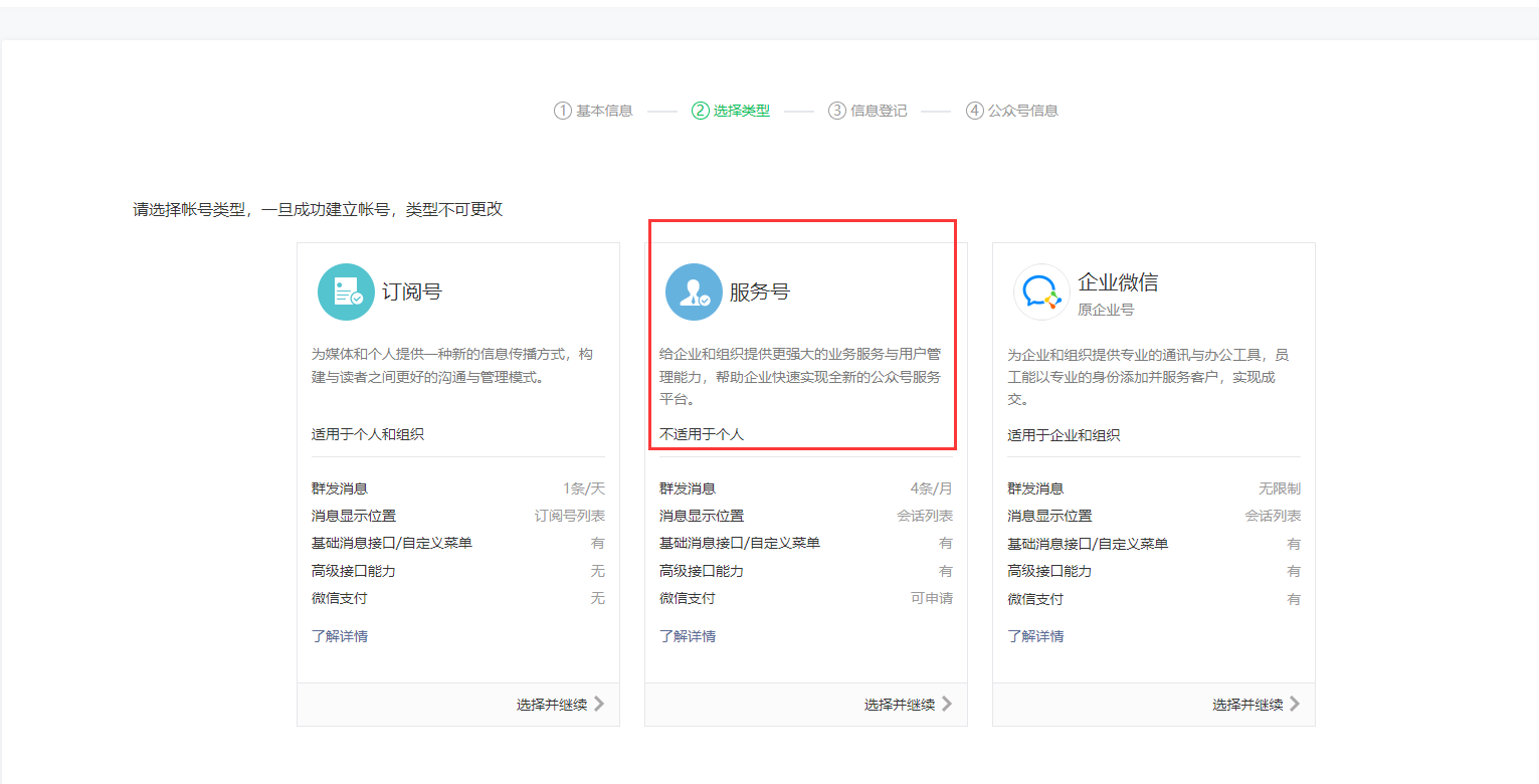 三、选公众号类型选择服务号