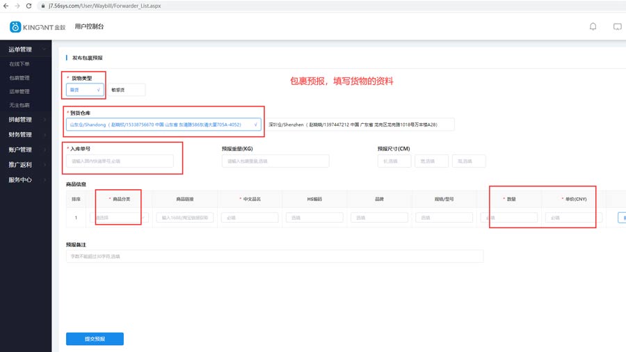 在集运服务商的集运系统里(以金蚁的J7集运系统为例),进行包裹预报,告诉集运服务商,我有包裹要到你们仓库了。