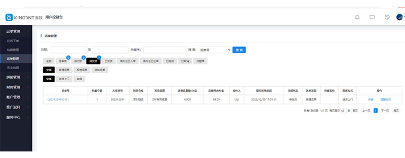 “运单管理”页面可以查看“待审核”“待付款”“待发货”“海外仓已入库”“海外仓已出库“ “ 已完成 ”已取消”问题单”等状态的运单,界面如下:
