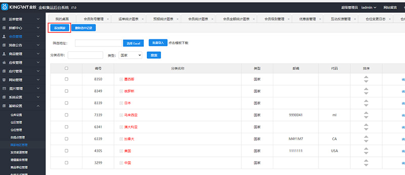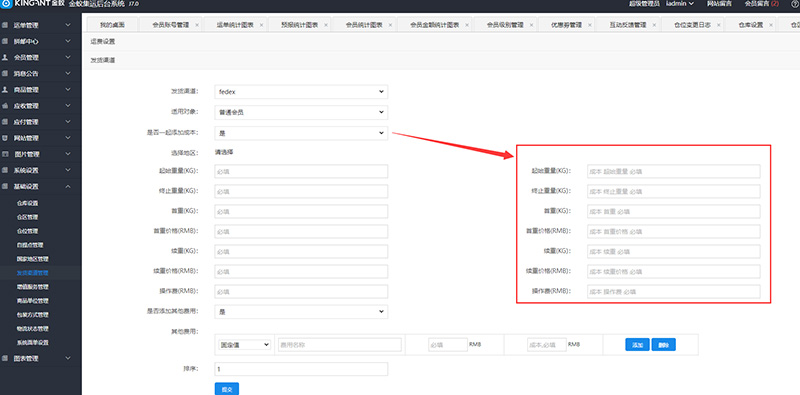添加、编辑 运费或 运费成本时,需要选择发货渠道、会员分类及地区,并填写起始重量、终止重量、首重、首重价格、续重、续重价格、操作费等信息,页面如下: