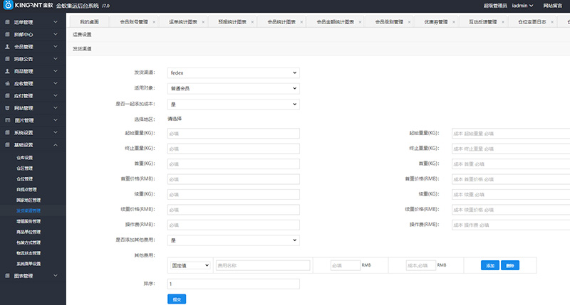 在“基础设置”—“发货渠道管理”页面,添加“发货渠道”以后,还需要对各渠道的 运费 及 运费成本进行设置。