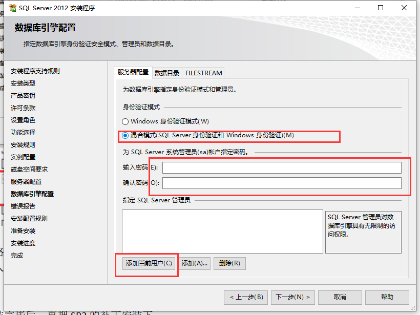 输入SA密码要复杂些,最好拿个记事本打好后再复制粘贴到密码这里。