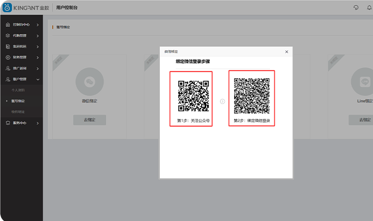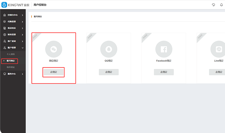 第二步:点击左侧导航,选择“账户管理”,点击“账号绑定”功能。操作界面,如下图: