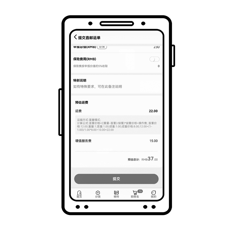 PC会员端 & 移动端:在提交直邮运单的页面,现支持手动输入“入库重量”,系统将实时计算并显示“运费预估”,帮助您更精准地掌握运输成本。